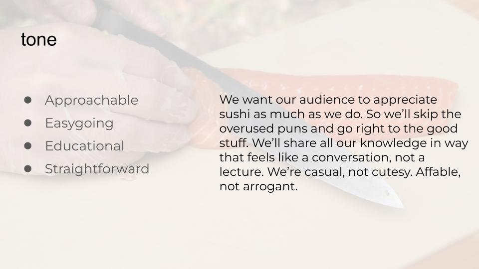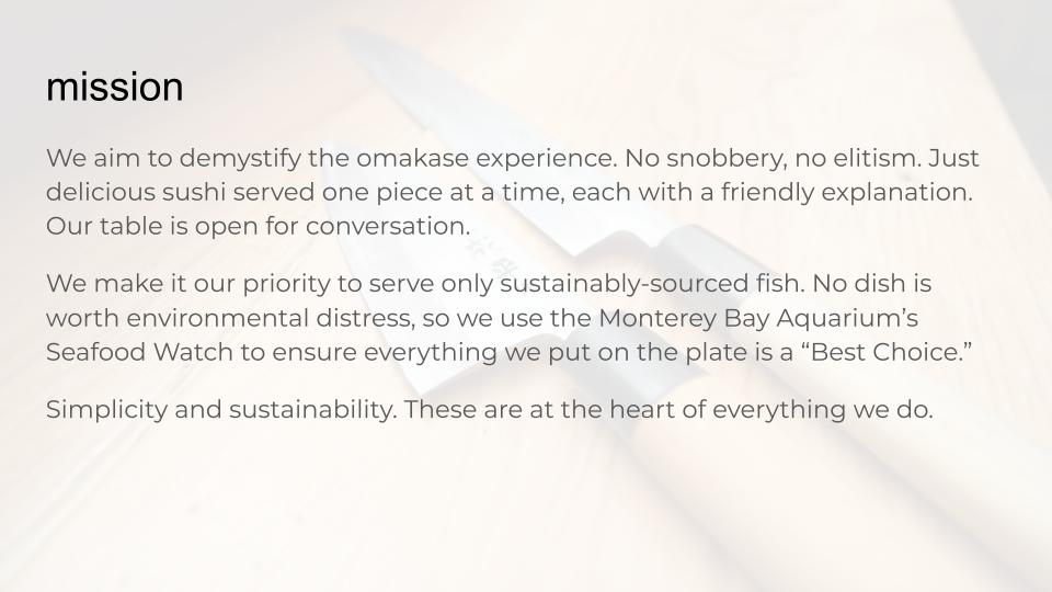 I created a brand book that outlined the brand mission, tone, and look. I analyzed the current omakase market and developed a voice that felt distinct in the space.